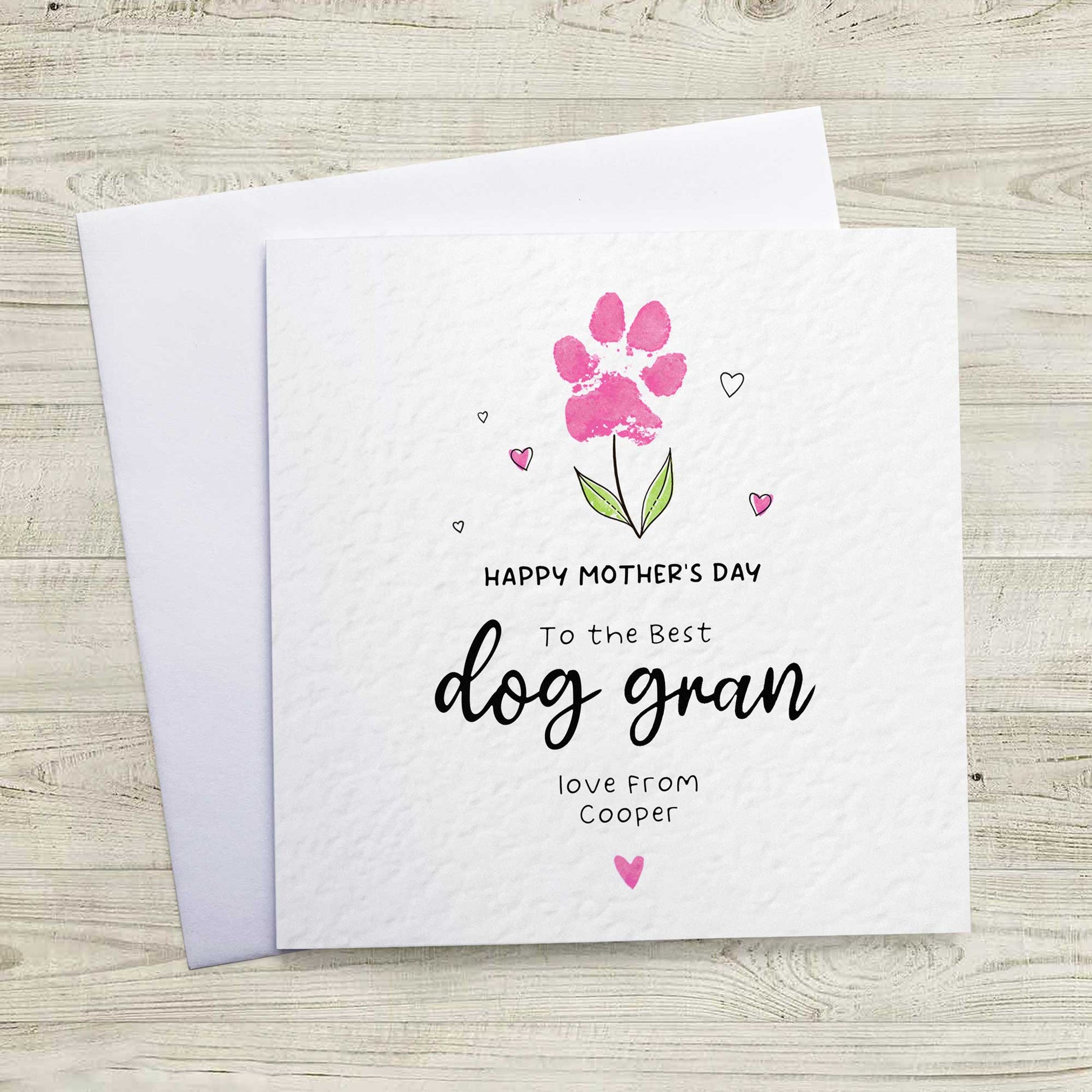 Celebrate a very special dog grandma with a paw print Mothers Day card from the dog. This card is made especially for the dog gran who adores their grand dog(s). The paw print design is available in various colours to suit the personality or gender of your dog. Whether your pet calls her Dog Grandma, Dog Gran, or Dog Nana this is a unique Mothers Day gift that she will treasure along after her special day.