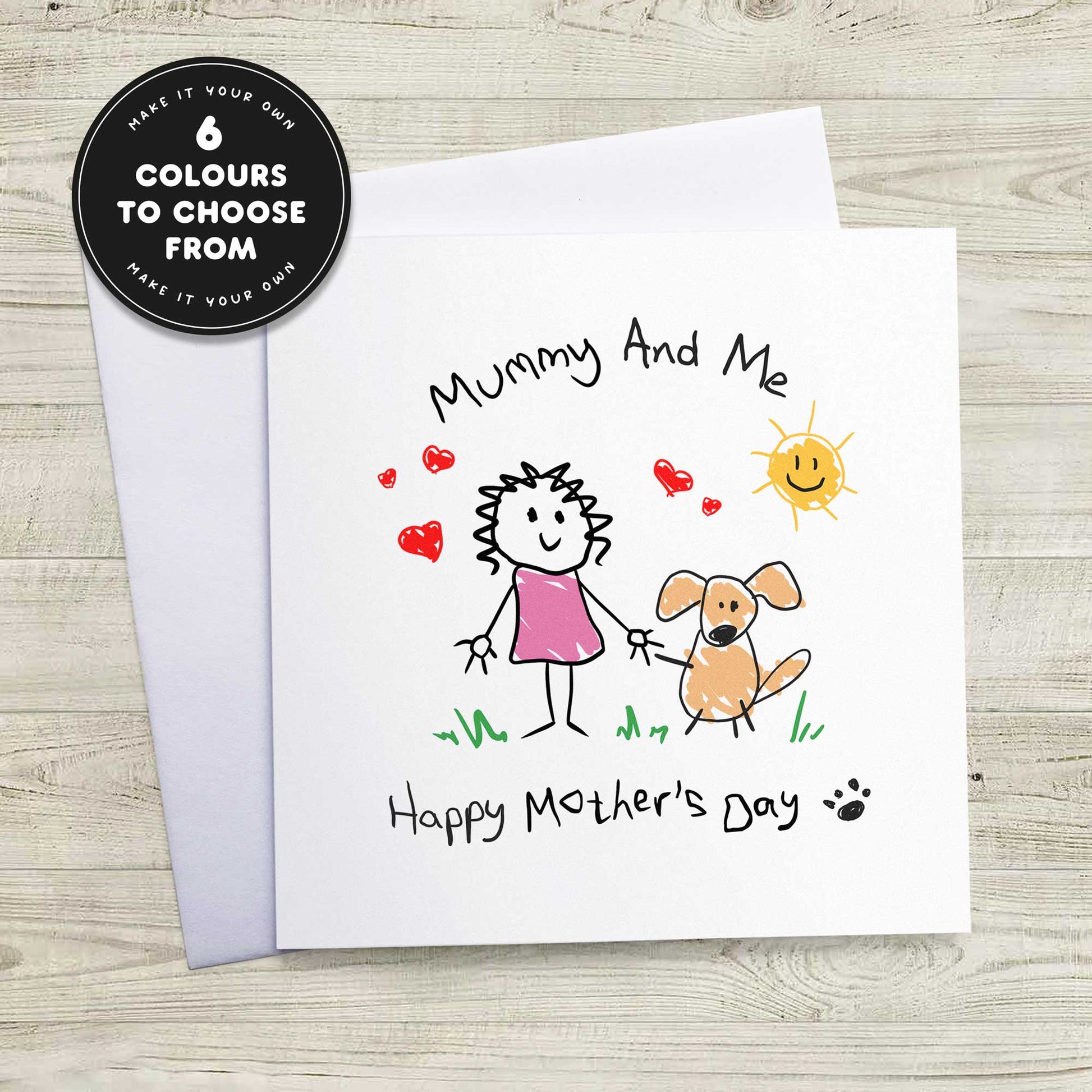 Celebrate the love between a dog and their favourite human with this Dog Mum Mothers Day Card, designed to look like it was drawn by the dog themselves. Featuring a sweet “Mummy & Me” illustration of a pup holding their mum’s hand, this card captures that pure, joyful bond that only dog mums truly understand.